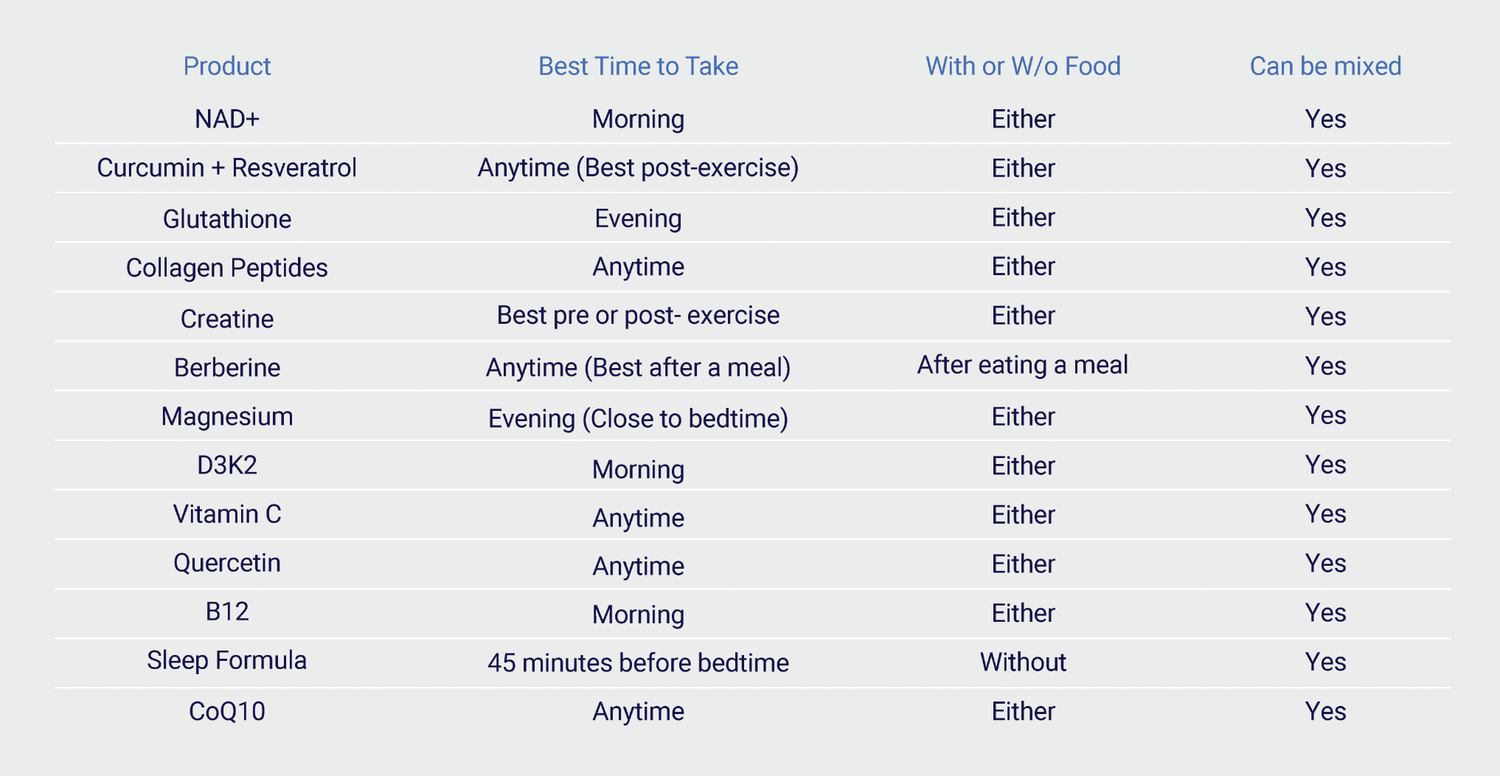 We’ve created a helpful table that shows the best time to take each of our products and lets you know which ones can be combined safely. It's a great resource to get the most out of your routine!
